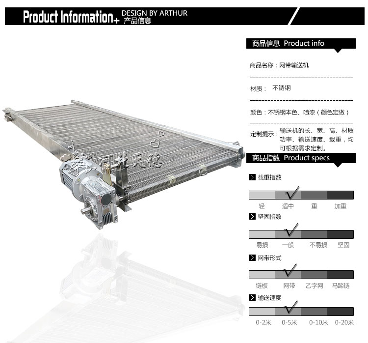 1.網帶輸送機以不銹鋼網帶為輸送介質,其特性堅固,耐磨、不拍尖銳的物品劃傷,輸送豬肉、雞鴨、魚蝦等干凈衛生;